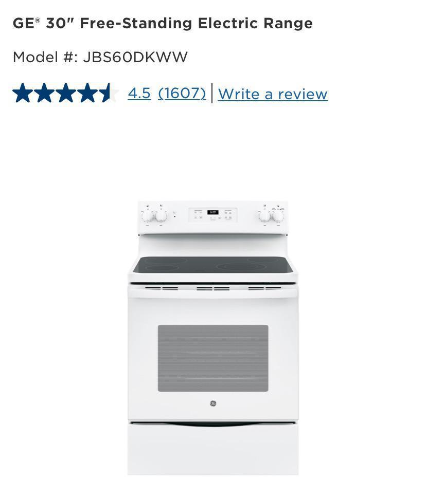 Estufa eléctrica independiente GE modelo JBS60DKWW en color blanco, diseñada con superficie lisa y cuatro elementos de cocción. Posee controles superiores con perillas laterales y panel digital central, ofreciendo funcionalidad moderna y fácil limpieza. Ideal para cocinas que buscan eficiencia con estilo clásico.