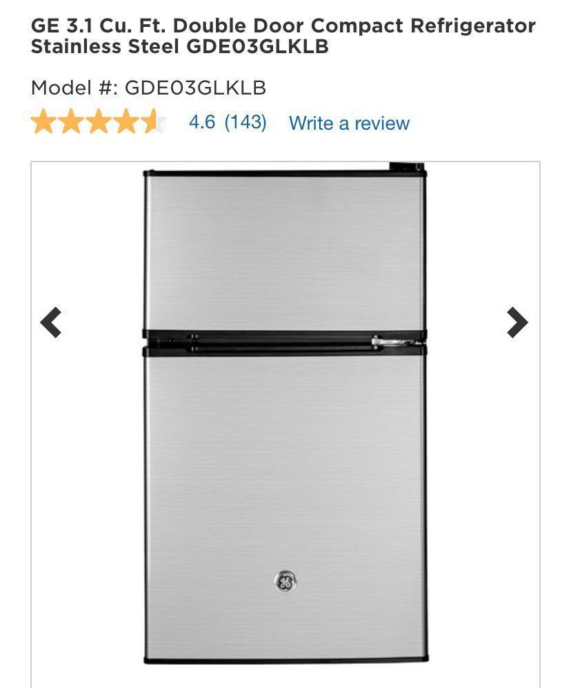 Refrigerador compacto GE de 3.1 pies cúbicos con doble puerta en acero inoxidable, modelo GDE03GLKLB. Su diseño moderno lo hace ideal para espacios reducidos, ofreciendo almacenamiento eficiente en un formato elegante y funcional. Perfecto para oficinas, estudios o dormitorios.