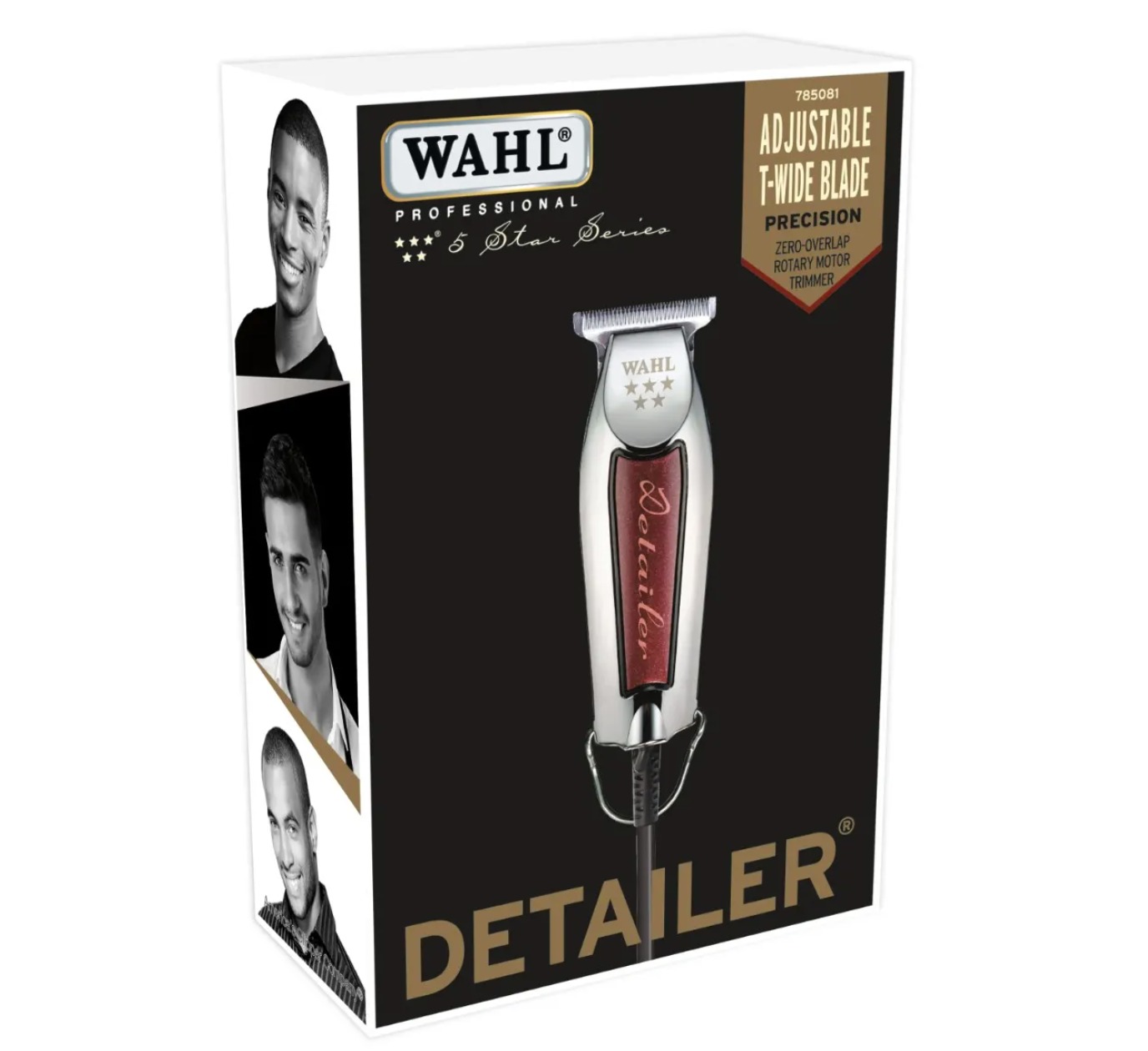Wahl Detailer (Trimmer): La experta en acabados. Su cuchilla en «T» extra ancha permite delinear con precisión quirúrgica, marcar contornos y realizar diseños detallados al ras.