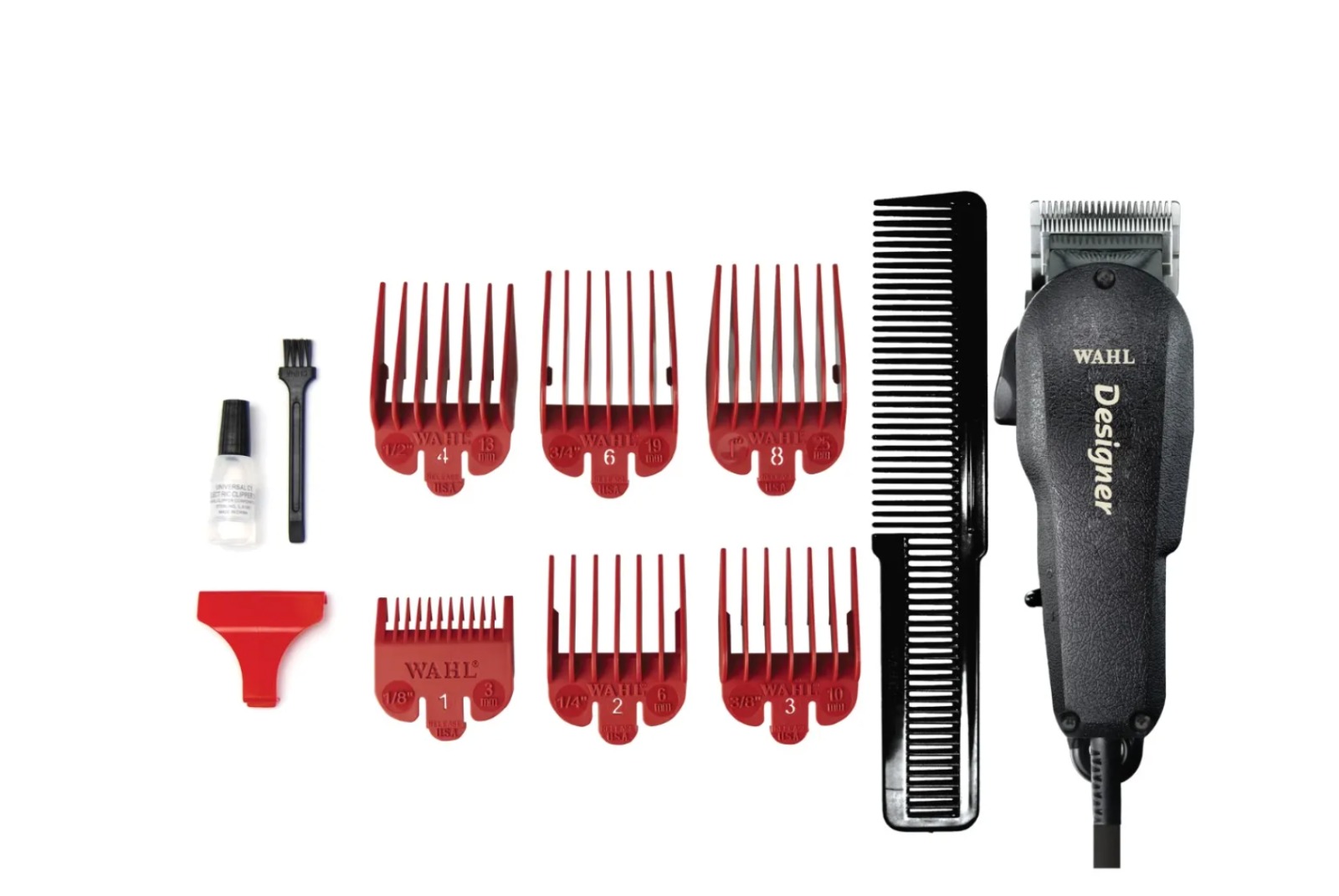 Wahl Designer (Clipper): La máquina de batalla. Equipada con un motor vibrador de alta potencia, ideal para cortes generales y desvanecidos (fades) perfectos. Incluye 6 peines guía y accesorios de mantenimiento.