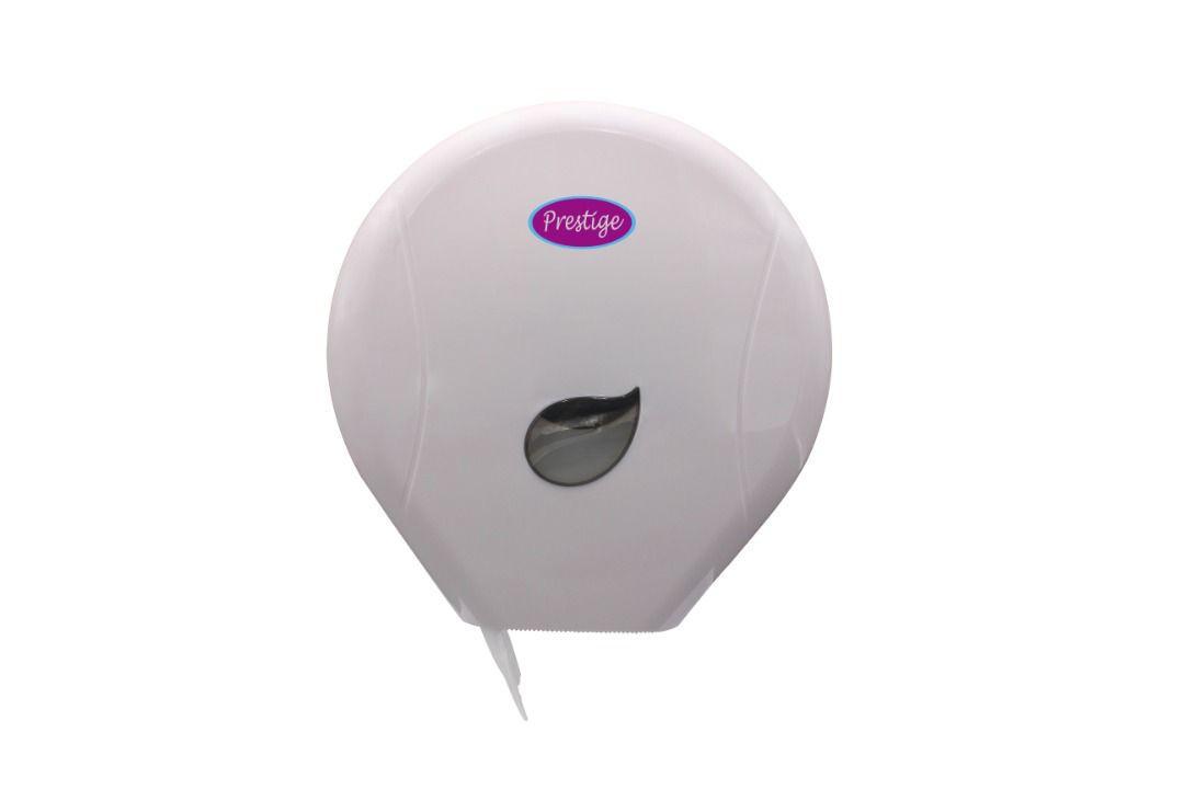 Este equipo es un dispensador de papel higiénico jumbo de pared, ideal para baños públicos o de alto tránsito. Su diseño blanco y robusto, con la marca «Prestige», asegura higiene y durabilidad, dispensando rollos grandes de forma eficiente y controlada.